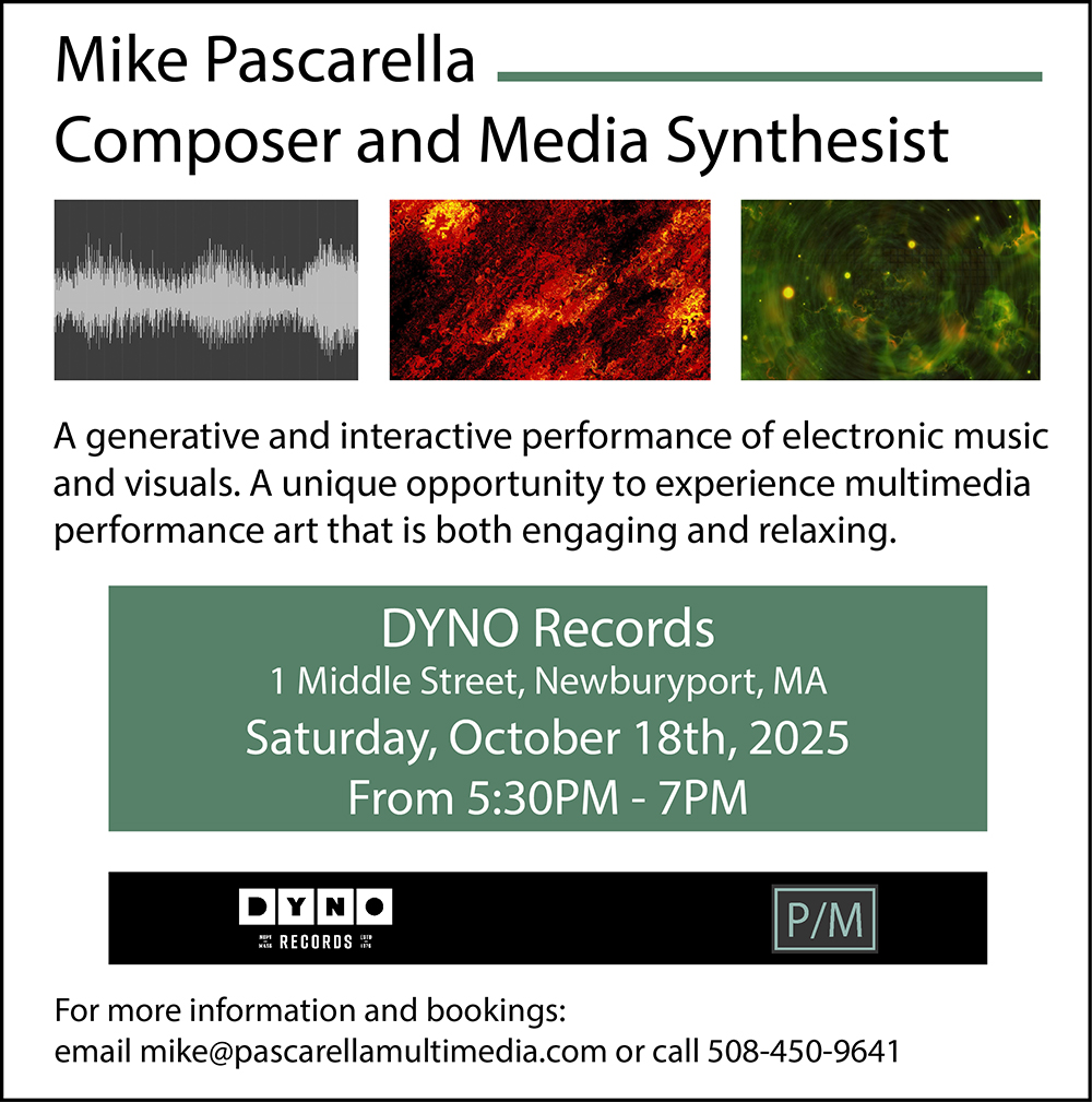 Mike elaborates; "Electronic music has long represented the cutting edge of composition, process, and technology. By applying generative and improvisational processes to sound and visuals, we will together explore and experience unique non-repeatable creations."